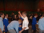 Nuair a bhí na ceisteanna agus an bronnadh thart chuir Gael-Linn céilí ar siúl. Do na daoine a bhí sa Ghaeltacht roimhe bhí sé simplí go leor, agus do na daoine nach raibh; bhuel seo roinnt pictiúr thíos don iarracht a rinne siad. (After the quiz a céilí took place which the boys enjoyed as you can see below.)
